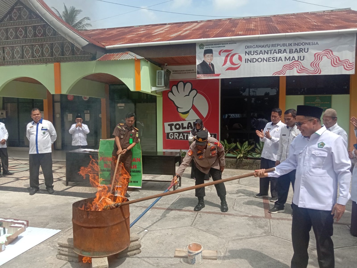 PAYAKUMBUH, METRO–Kepala Kantor Kementerian Agama (Kan Kemenag) Kota Payakumbuh, H.Joben bersama Kapolres Payakumbuh, Kejari Payakumbuh, melakukan pemusnahan sebanyak 2052 buku nikah dengan cara dibakar di bagian depan kantor Kemenag Kota Payakumbuh, Jalan Pahlawan, Sawah Padang, Kota Payakumbuh, Selasa (3/9).