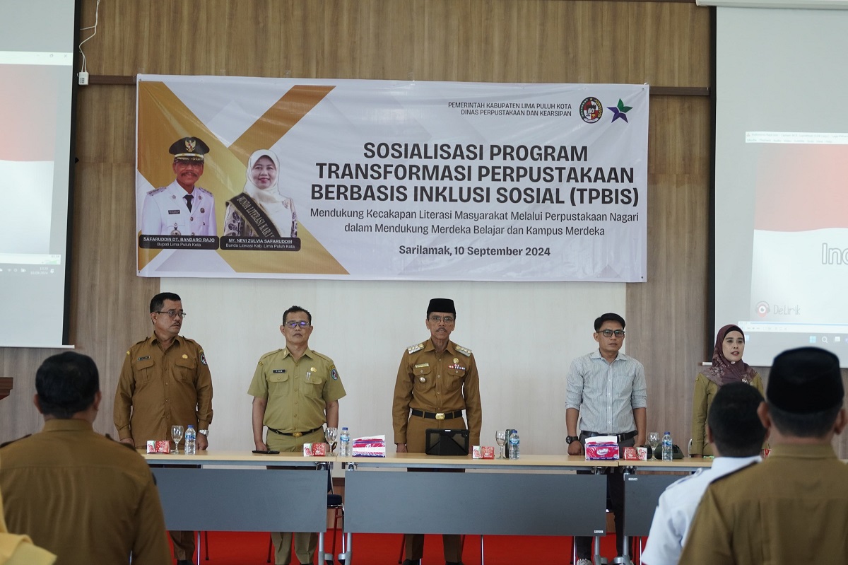 SOSIALISASI— Bupati Limapuluh Kota, Safaruddin Dt.Bandaro Rajo saat pembukaan kegiatan sosialisasi Transformasi Perpustakaan Berbasis Inklusi Sosial (TPBIS).