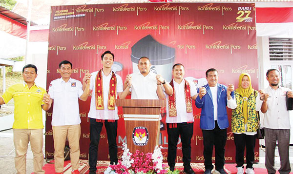PENDAFTARAN— Ketua DPD Partai Gerindra Sumbar H Andre Rosiade turut mengantarkan pasangan calon (paslon) Riyanda Putra-Jeffry Hibatullah sebagai Calon Wali Kota-Calon Wakil Wali Kota Sawahlunto periode 2024-2029 ke KPU Sawahlunto, beberapa waktu lalu.