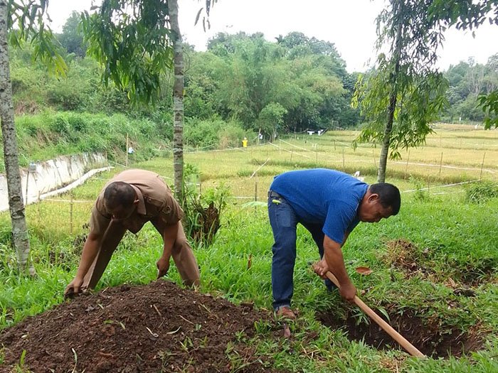 BUAT—Terlihat petugas DLH Kota solok sedang membuat lubang resapan yang diisi sampah organik.
