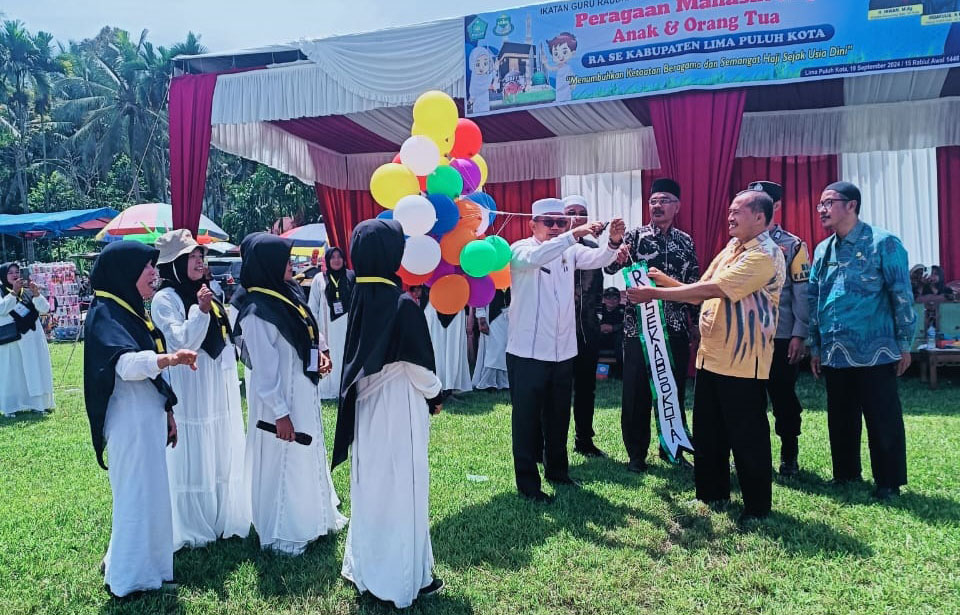 LIMAPULUH KOTA, METRO–Kepala Kantor Kementerian Agama (Kakan Kemenag) Kabupaten Lima Puluh Kota H.Irwan didampingi Kasi Penmad, H. Rizki Eka Putra, membuka secara resmi kegiatan peragaan manasik haji anak dan orang tua RA se-Kabupaten Lima Puluh Kota, Kamis (19/9), di Lapangan Bola Kaki Pilubang, Nagari Pilubang, Kecamatan Harau.