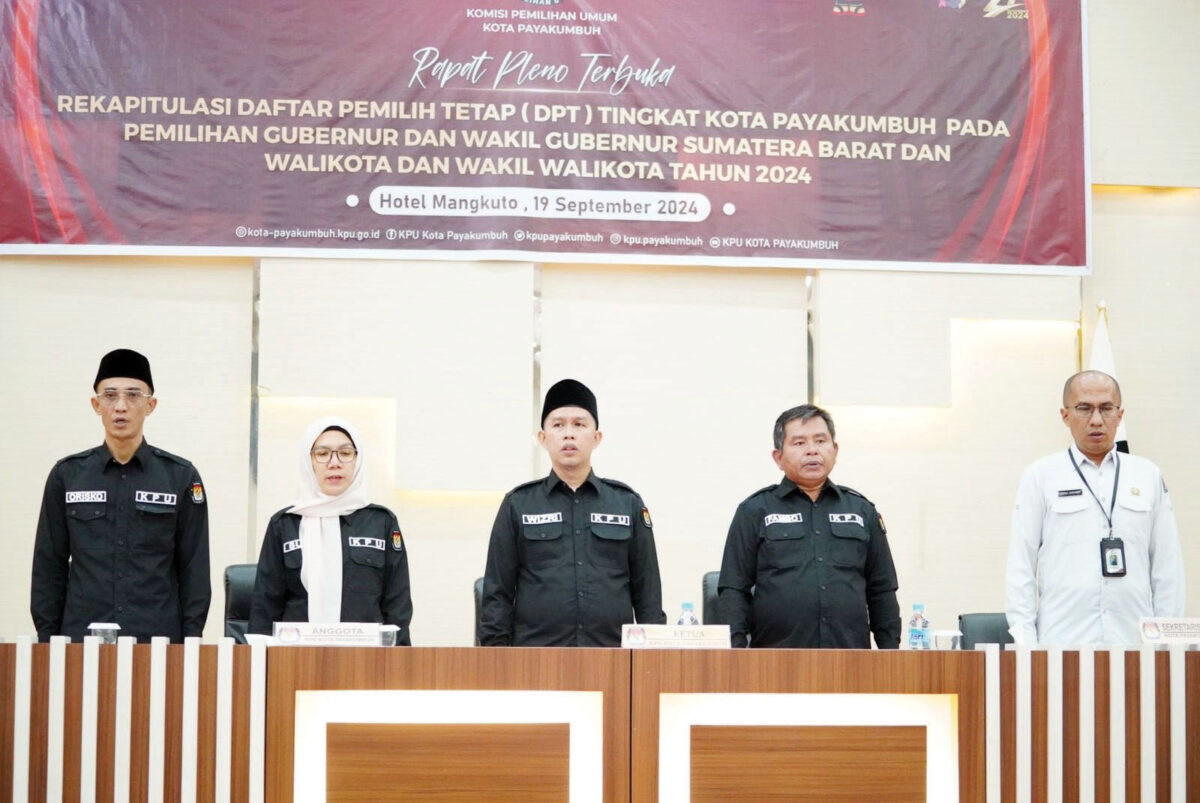 PAYAKUMBUH, METRO–Rapat pleno terbuka Komisi Pemilihan Umum (KPU) Kota Payakumbuh, Kamis (19/9) menetapkan 104.308 pemilih dalam Daftar Pemilih Tetap (DPT) untuk pemilihan serentak nasional atau Pilkada 2024.