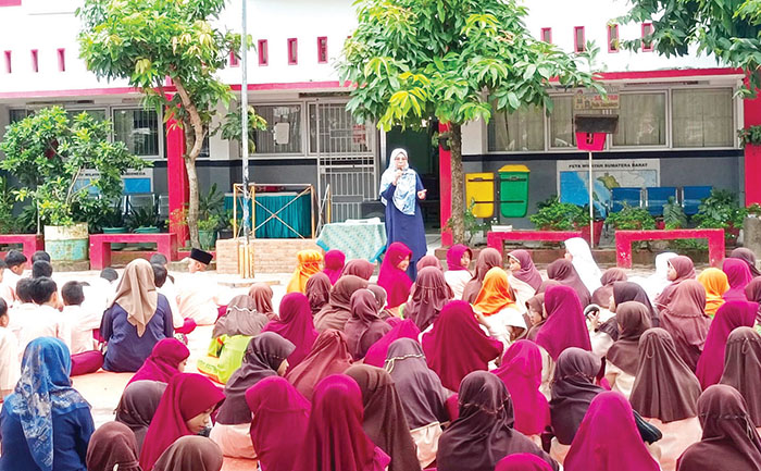 KULTUM JUMAT— Guru PAI kelas 6 SDN 06 Kampung Lapai, Kecamatan Nanggalo, Ummi Suhaimi SAg, MPdI, memberikan ceramah singkat dengan tema “Meneladani Sifat Mulia Nabi Muhammad SAW, dalam kegiatan Kultum Jumat, Jumat (20/9) pagi.