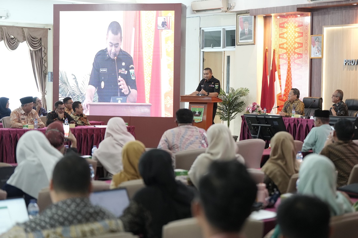 SAMBUTAN—Plt Gubernur Audy Joinaldy, memberikan sambutan usai membuka rapat koordinasi tentang Penanggulangan Kemiskinan dan Penghapusan Kemiskinan Ekstrem, Kamis (26/9) di Aula Kantor Bappeda Sumbar.