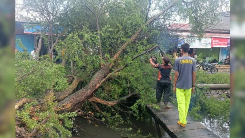 Di Jalan Perintis Kemerdekaan No. 54, RT 003 RW 02, Kelurahan Jati, Kecamatan Padang Timur, pohon jenis Inai dengan panjang sekitar 20 meter dan diameter 60 cm tumbang, menimpa kabel listrik serta menghalangi akses jalan.