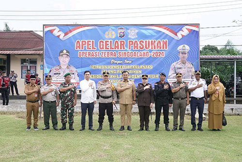 DHARMASRAYA, METRO–Bupati Dharmasraya Sutan Riska Tuanku Kerajaan menghadiri Apel Gelar Pasukan Operasi Zebra Singgalang yang dilaksanakan di halaman Mapolres Dharmasraya, Senin (14/10). Operasi Zebra terhitung dilaksanakan serentak pada hari ini, 14 sampai 27 Oktober 2024 mendatang.
