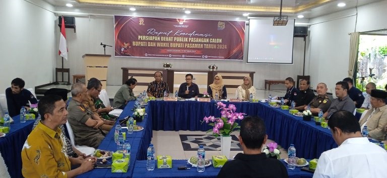 PASAMAN, METRO–Menjelang debat pasangan calon Komisi Pemilihan Umum (KPU) Pasaman menggelar rapat koordinasi persiapan debat publik pasangan calon bupati dan wakil bupati pada pemilihan serentak tahun 2024 di aula Hotel Arumas Lubuk Sikaping, Selasa (15/10).