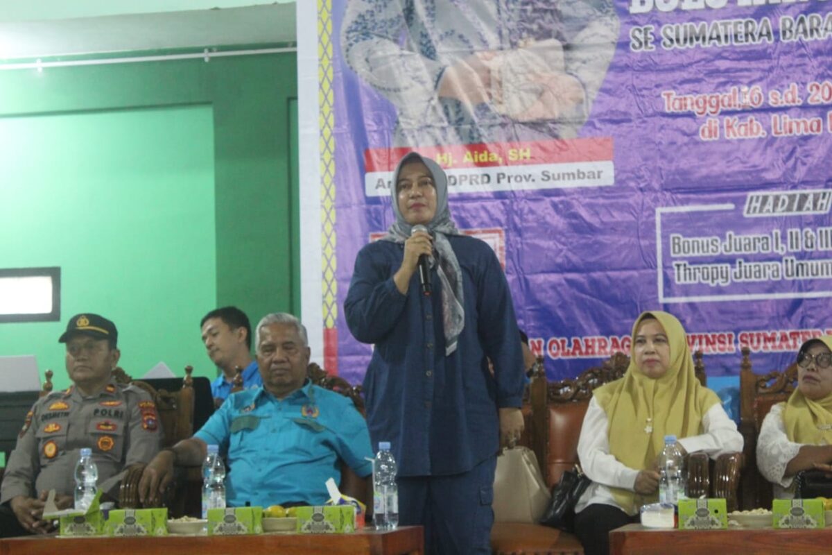 Anggota DPRD Sumbar, Hj.Aida, SH yang membuka kejurprov Bulutangkis se-Sumatera Barat, mengucapkan selamat bertanding kepada seluruh atlit baik KU 8 tahun dan KU 12 tahun serta nomor veteran. Tentu saja, diharapkan seluruh atlit Bulutangkis dalam bermain selalu menjunjung sportivitas.