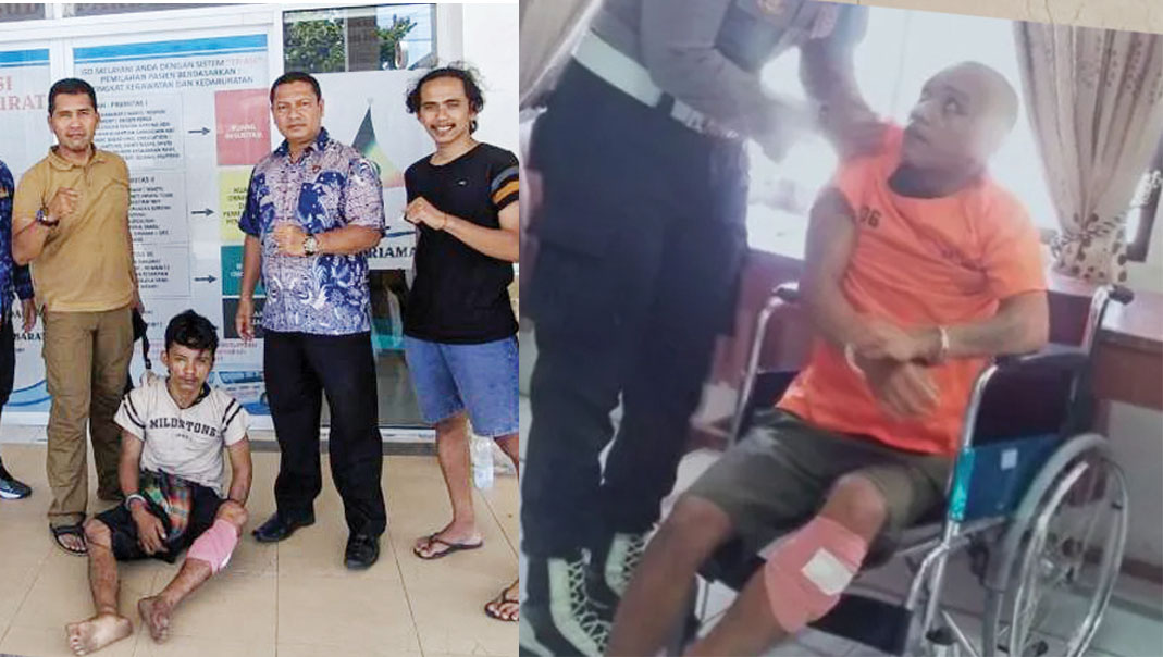 Saat dihadirkan dalam konferensi pers tersangka terduduk di kursi roda dengan luka tembak di betis kanan. Terlihat kondisi kaki kiri tersangka terbalut kain dan perban, setelah mendapat tindakan tegas terukur.