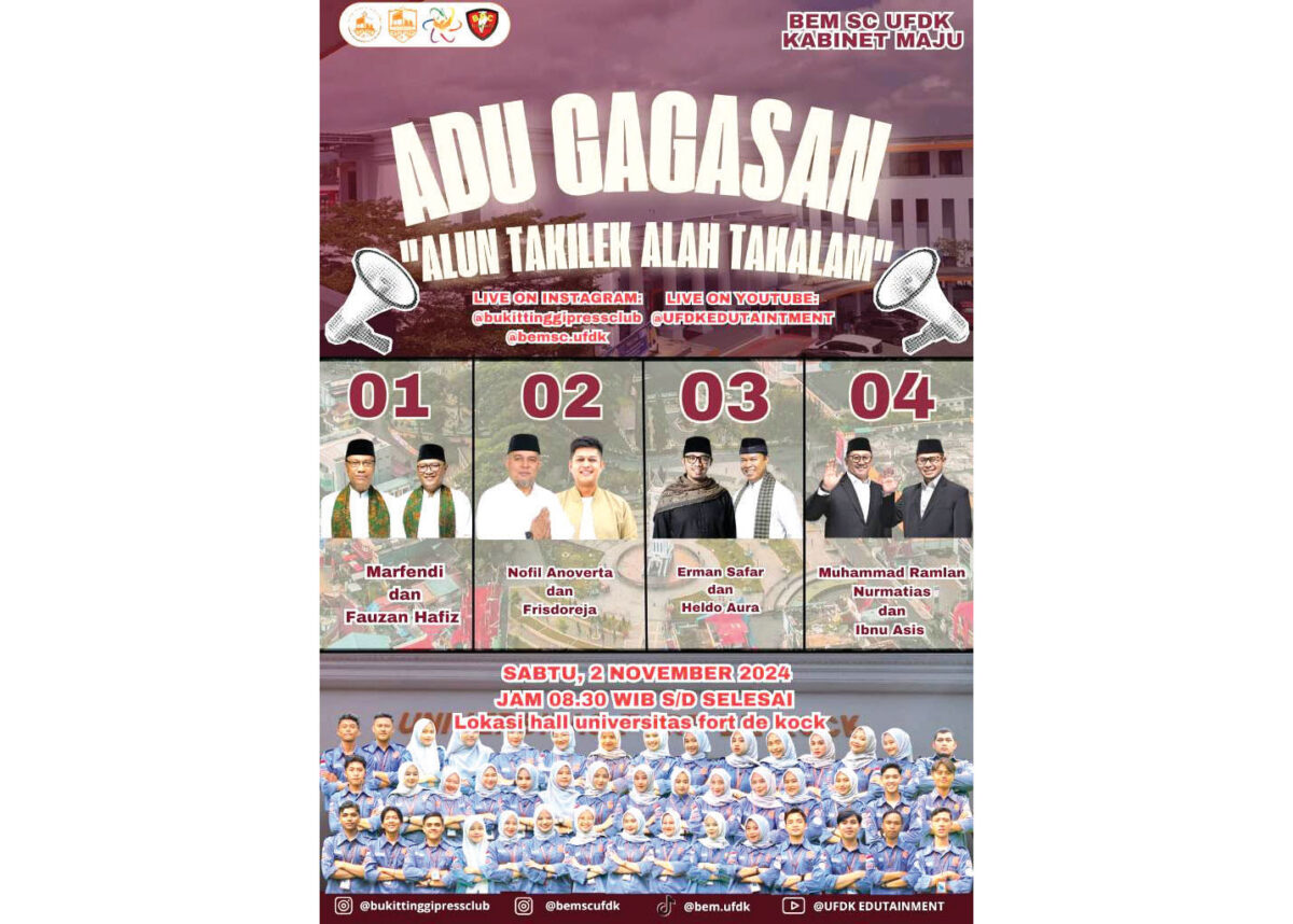 Kegiatan ini rencananya akan disiarkan secara langsung di Youtube @UFDKEDUTAINMENT serta di Instagram @bemsc.ufdk dan @bukittinggipressclub. (pry)