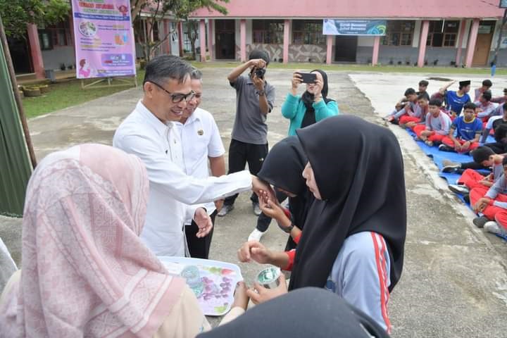 SAWAHLUNTO, METRO–Penjabat Sekretaris Daerah Kota Sawahlunto Ezeddin Zain, SH, ME, memantau pelaksanaan Aksi Bergizi di SMA Negeri 3 Sawahlunto, pada Rabu (6/11).
