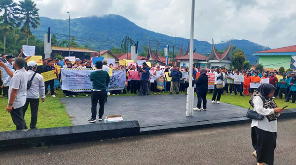 PDG.PANJANG,METRO–Ratusan Tenaga Harian Lepas (THL) dan honorer di lingkungan Pemerintah Kota (Pemko) Padangpanjang gelar aksi damai di Halaman Kantor Balaikota, Selasa (19/11). Mereka menyampaikan empat tuntutan atas nasib mereka yang terancam dirumahkan.