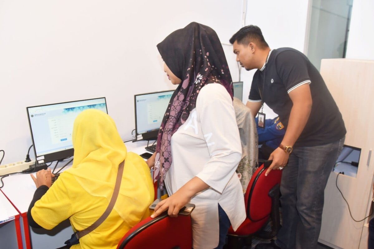 PELATIHAN CAT— Dua petugas sedang mengawasi calon peserta PPPK belajar komputer dan memberikan simulasi ujian Computer Assisted Test (CAT).
