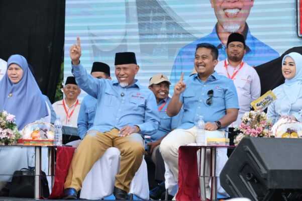 Padang – Calon Gubernur dan Wakil Gubernur Sumbar Nomor Urut 1 Mahyeldi-Vasko Ruseimy menggelar kampanye akbar di Pelataran Parkir GOR Haji Agus Salim, Padang, Jumat (22/11/2024).