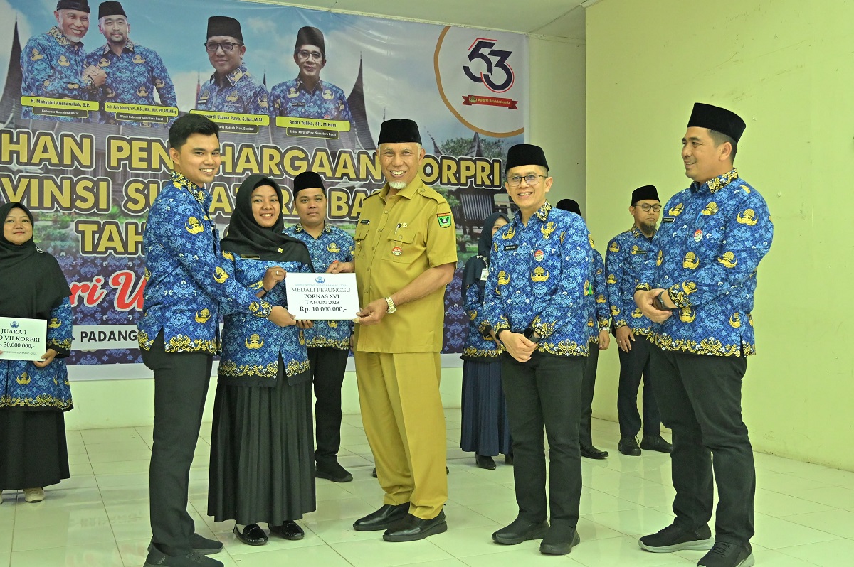 PADANG, METRO–Gubernur Sumatera Barat (Sumbar), Mahyeldi Ansharullah, menyerahkan penghargaan bagi Anggota Korpri Sumbar berprestasi tahun 2024 di Aula Kantor Dinas Nakertrans Sumbar, Selasa (26/11). Gubernur berharap, Korpri Sumbar terus mempertahankan berbagai capaian prestasi yang diraih, karena kualitas PNS adalah salah satu cerminan dari kualitas Sumber Daya Manusia (SDM) di Sumbar.