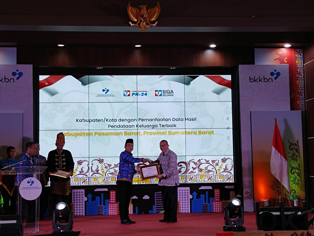 Piagam apresiasi kategori kabupaten/kota dengan pemanfaatan data hasil pendataan keluarga terbaik tahun 2024 itu diterima langsung oleh Pelaksana Tugas Kepala Bappelitbangda Pasbar, Ikhwanri, dalam acara Forum Data Keluarga Nasional yang turut diisi dengan diseminasi dan rilis hasil pemutakhiran pendataan keluarga tahun 2024.