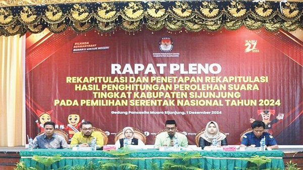 Rapat pleno rekapitulasi tingkat kabupaten itu dipimpin langsung Ketua KPU Sijunjung, Dori Kurniadi dan komisioner lainnya, Bawaslu, perwakilan kedua pasangan calon serta unsur Forkopimda.