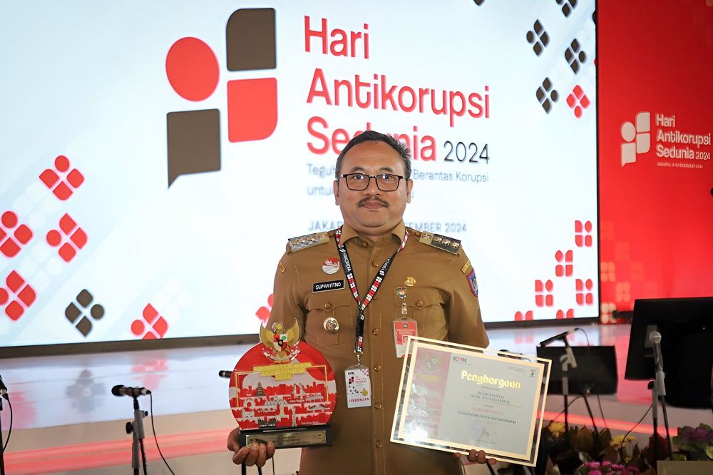 TERIMA PENGHARGAAN— Pj Wali Kota Payakumbuh Suprayitno saat menerima penghargaan sebagai Kabupaten/Kota Percontohan Antikorupsi pada peringatan Hari Antikorupsi Sedunia (HAKORDIA) 2024 di Gedung Juang Merah Putih Komisi Pemberantasan Korupsi (KPK), Jakarta, Senin (9/12).
