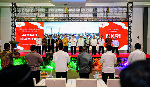 SOLO, METRO–Sebanyak 1.500 anggota eks Ja­maah Islamiyah (JI) mendeklarasikan pembubaran organinasinya. Mereka juga mengikrarkan diri bakal setia kepada Pancasila dan Negara Ke­satuan Republik Indonesia (NKRI). Teriakan takbir saat menggema dalam Convention Hall Terminal Tirtonadi, Solo, Jawa Tengah saat salah satu dari mereka memantik semangat.
