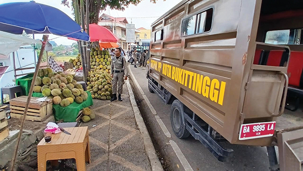 BUKITTINGGI, METRO–Petugas dari Dinas Sa­tuan Polisi Pamong Praja (Satpol PP) Kota Bukittinggi menertibkan pedagang durian yang berjualan di jalur padat lalu lintas di kawasan Jalan Pemuda, Senin (30/12).