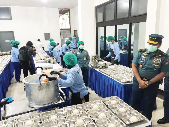 TINJAU— KSAL Laksamana TNI Muhammad Ali meninjau dapur umum program Makan Bergizi Gratis di Seskoal, Jaksel pada Selasa (14/1).