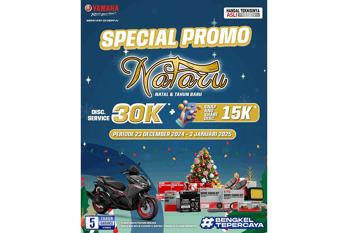 PADANG, METRO–Menyambut libur Nataru dan awal tahun, Yamaha Tjahaja Baru memberikan promo servis menarik bagi pemilik sepeda motor Yamaha. Promo spesial di bulan Desember 2024 dan Januari 2025 Pada dealer dan bengkel resmi Yamaha area Sumatra Barat. Tak hanya mendapatkan bingkisan spesial, namun terdapat juga garansi spareparts Yamaha jika terdapat kerusakan atau permasalahan pada motor konsumen.
