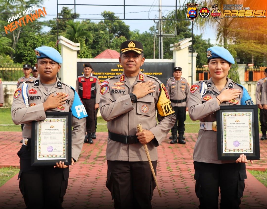 MENTAWAI, METRO–Dalam rangka memberikan apresiasi kepada personel yang berprestasi, Kapolres Kepulauan Mentawai AKBP Rory Ratno memberikan piagam penghargaan kepada dua anggota Polri yang telah mengharumkan nama institusi melalui prestasi diajang olahraga tingkat nasional dan internasional.