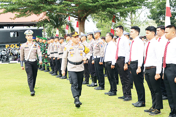 CEK PASUKAN— Operasi Keselamatan Singgalang tahun 2025 resmi dimulai serentak pada Senin (10/2). Kapolres Sijunjung AKBP Andre Anas memimpin apel gelar pasukan yang bertempat di lapangan upacara Polres Sijunjung.