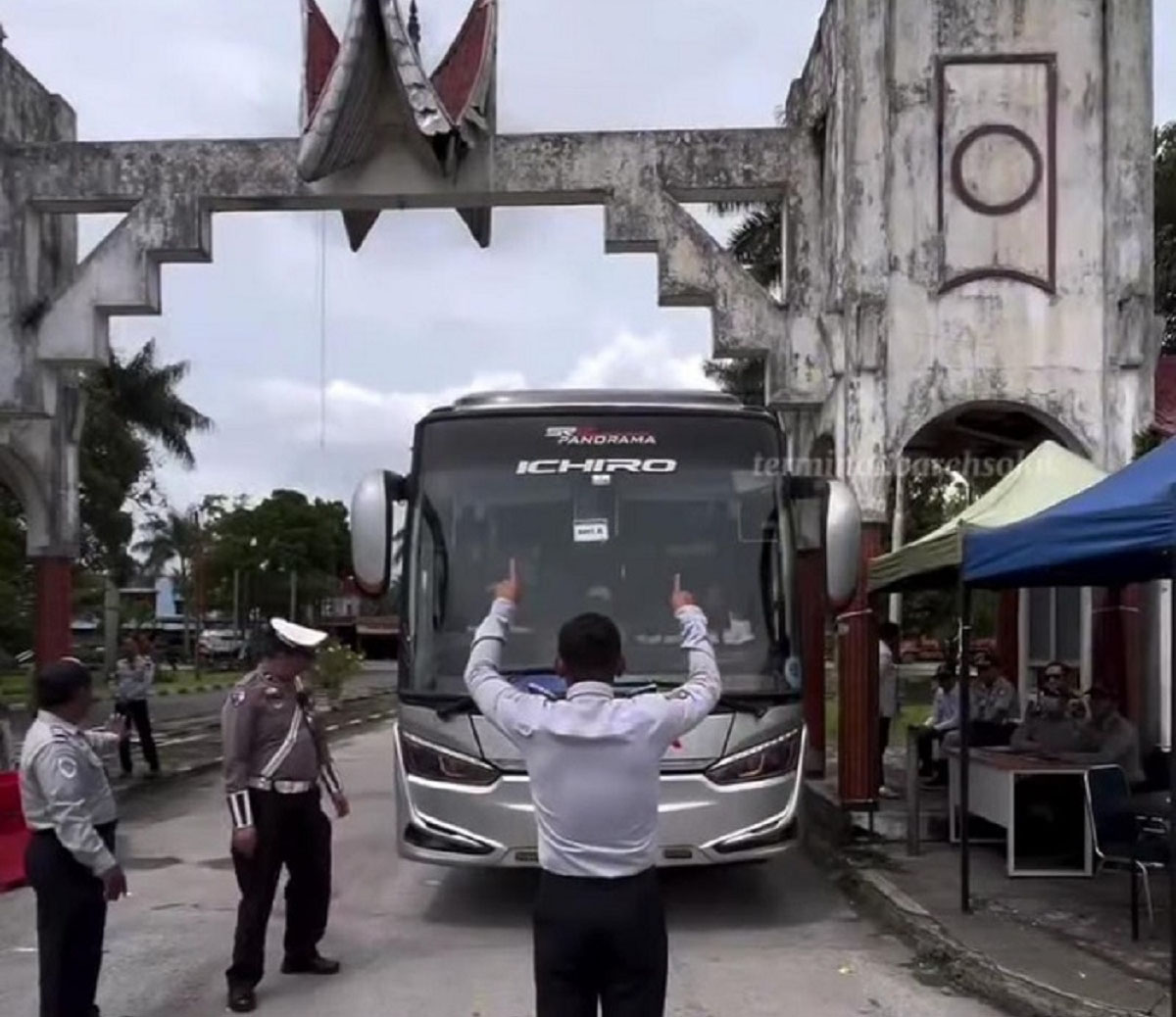 PEMRRIKSAAN—Terlihat tim gabungan Dinas Perhubungan (Disbhub) Kota Solok saat memberhentikan bis yang akanjmasuk ke Terminal Kota Solok untuk dilakukan pemeriksaan.