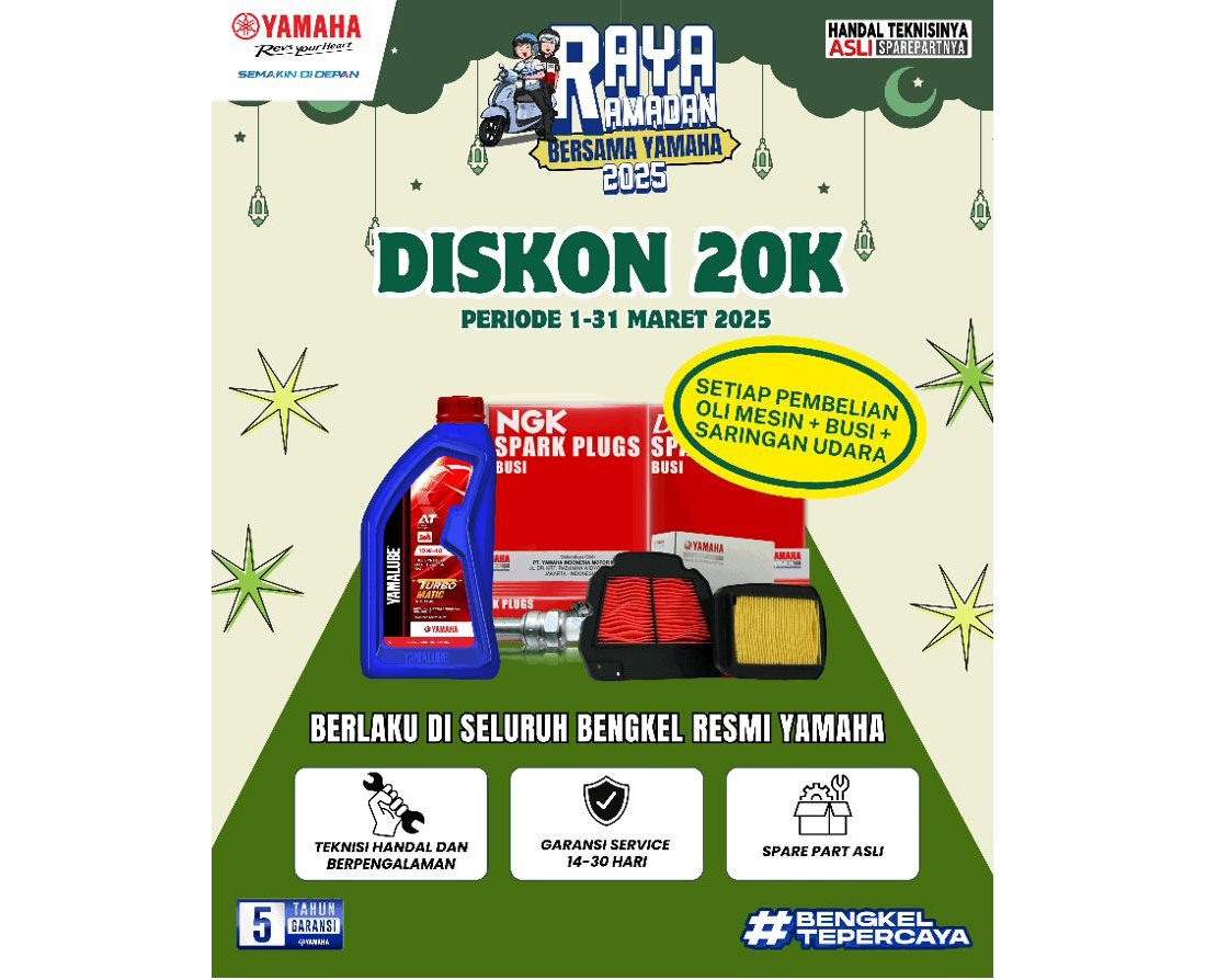 Khusus konsumen Yamaha dapat memastikan sepeda motor dalam kondisi terbaiknya dengan memercayakan motornya kepada bengkel resmi terdekat untuk diservis. Di bulan yang penuh berkah, Yamaha memiliki promo servis menarik bagi seluruh konsumen Yamaha berupa potongan harga dua puluh ribu setiap pembelian busi, saringan udara, dan oli mesin di seluruh bengkel resmi Yamaha dari tanggal 1 sampai 31 Maret 2025.