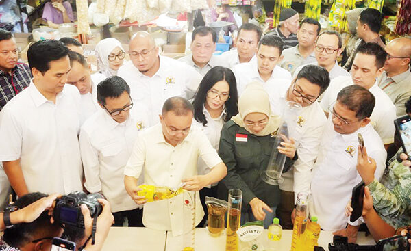 JAKARTA, METRO–Wakil Ketua Komisi VI DPR RI Andre Rosiade mendampingi Wakil Ketua DPR RI Sufmi Dasco Ahmad beserta jajaran Komisi VI mengunjungi Pasar Induk Kramat Jati, Jakarta, Jumat (14/3). Tujuannya melakukan inspeksi mendadak (sidak) terhadap produk-produk minyak goreng rakyat (MGR) atau Minyakita, setelah adanya sejumlah kasus produk tak sesuai dengan takaran.