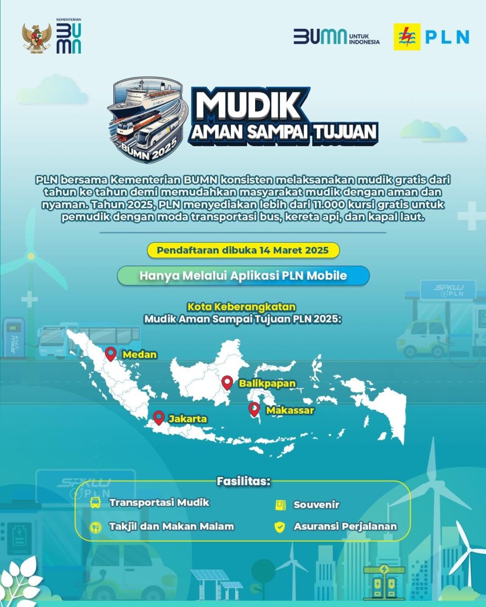 JAKARTA, METRO–Menjelang perayaan Hari Raya Idulfitri 1446 Hijriah, PT PLN (Persero) bersama Kementerian Badan Usaha Milik Negara (BUMN) membuka program Mudik Gratis BUMN 2025 dengan tema “Mudik Aman Sampai Tujuan” yang pendaftarannya dimulai pada tanggal 14-18 Maret 2025. Program mudik ini akan dilaksanakan dari 4 kota asal keberangkatan dengan total kuota lebih dari 11 ribu peserta.