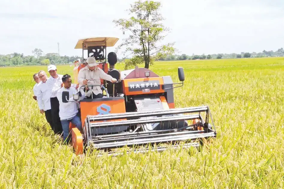 PANEN RAYA— Presiden Prabowo Subianto menjajal alat mesin pertanian saat panen raya di Majalengka, Jawa Barat, Senin (7/4).