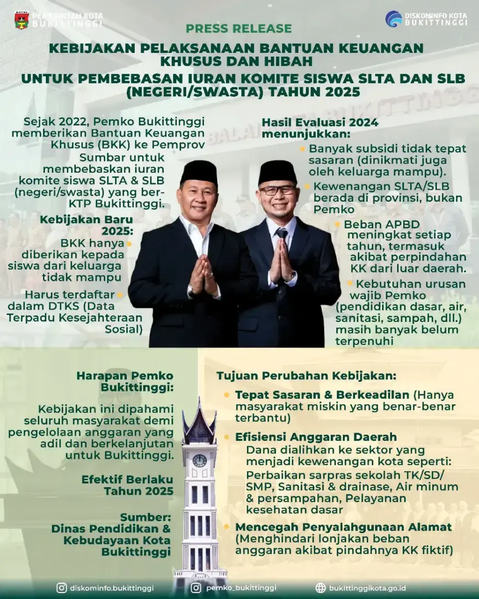Dengan pertimbangan dan hasil evaluasi yang telah dilakukan, maka pada tahun 2025 ini Pemerintah Kota Bukittinggi memutuskan untuk mengambil kebijakan Bantuan Keuangan Khusus kepada Pemerintah Provinsi Sumatera Barat yang digunakan untuk membebaskan uang komite siswa SLB/SMA/SMK hanya diberikan kepada siswa yang berasal dari keluarga kurang mampu dan terdaftar pada DTKS.