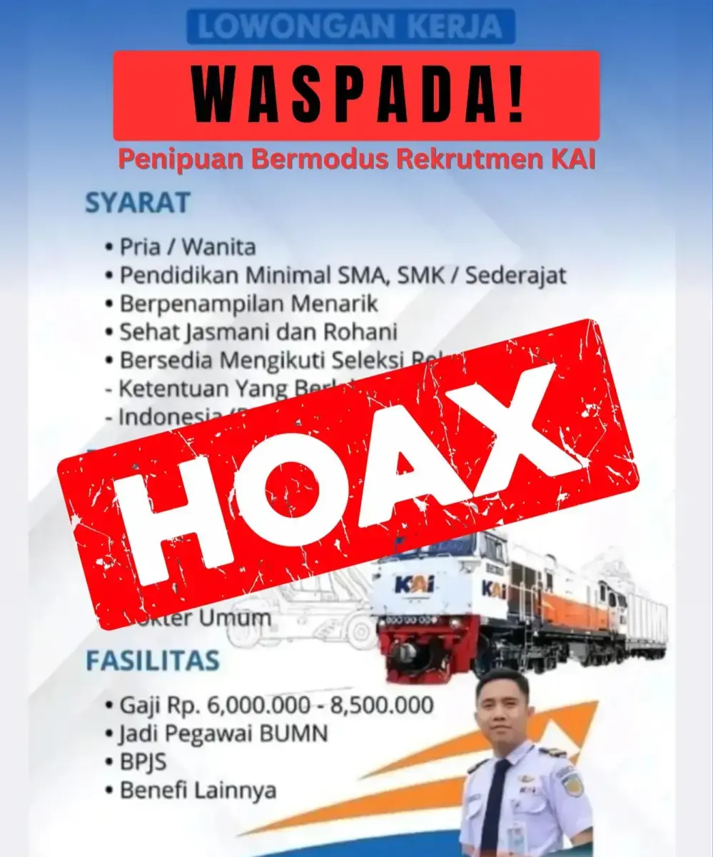 Reza menegaskan, informasi rekrutmen KAI menggunakan website resmi dengan alamat e-recruitment.kai.id dan media sosial resmi perusahaan @keretaapikita atau @kai121. Jika menemukan info rekrutmen tidak bersumber dari situs tersebut, agar masyarakat mengabaikannya.