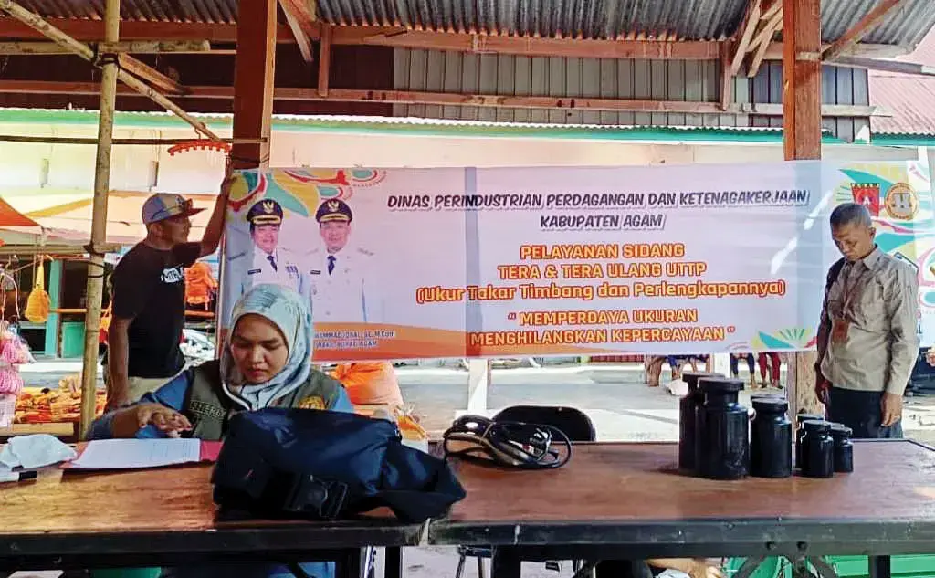 AGAM, METRO–Dalam upaya menciptakan perdagangan yang adil dan transparan, UPTD Metrologi Legal Dinas Perindustrian, Perdagangan, dan Ketenagakerjaan (Disperindagnaker) Kabupaten Agam menggelar kegiatan sidang tera dan tera ulang di Pasar Kayu Pasak, Kecamatan Palembayan, Rabu (14/5).