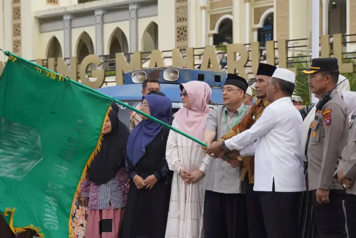 PADANG PANJANG, METRO–Wakil Wali Kota, Allex Saputra melepas sebanyak 99 orang jamaah haji Kota Padang Panjang di Masjid Agung Manarul Ilmi Islamic Centre, Kamis (15/5).
