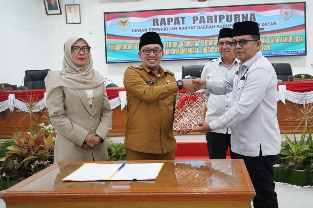 Keputusan ini disampaikan dalam Rapat Paripurna Pembicaraan Tingkat II Pengambilan Keputusan DPRD Kabupaten Tanah Datar tentang Ranperda Pertanggungjawaban APBD Tanah Datar Tahun 2014 dan Penyampaian Rekomendasi Tindak Lanjut Rekomendasi LHP BPK RI Tahun 2024, Selasa (24/6)di Ruang Sidang Utama Gedung tersebut
