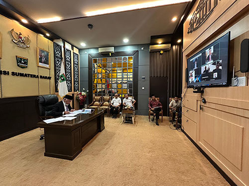 UJIAN TESIS— Gubernur Sumbar Mahyeldi Ansharullah enjalani sidang secara daring di Istana Gubernuran, Rabu (2/7). Mahyeldi lulus pada sidang tesis S2 Bidang Studi Magister Manajemen di University Islam Antarabangsa Sultan Abdul Halim Mu’adzam Shah (UniSHAMS), Malaysia., dengan mengangkat tema Wakaf sebagai materi tesis.