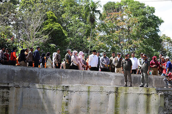 PDG. PANJANG, METRO–Usai acara peresmian di Lubuk Mata Kucing, Kepala Badan Nasional Penanggulanagan Bencana (BNPB), Letjend TNI Suharyanto juga meresmikan pemakaian Jembatan Tanjung-Tanah Bato, Padang Panjang Timur, Jumat (4/7). Peresmian ditandai dengan penguntingan pita oleh Kepala BNPB didampingi Wakil Gubernur Sumatera Barat, Vasko Ruseimy, Wali Kota Padang Panjang, Hendri Arnis.