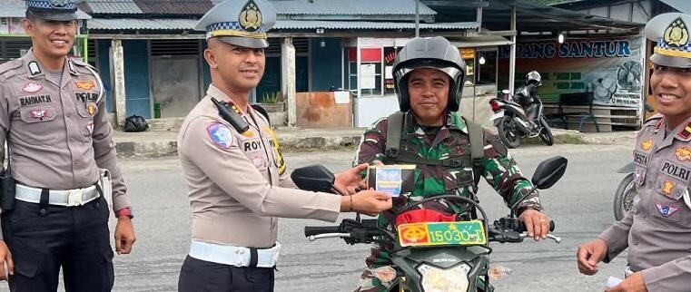 SAWAHLUNTO, METRO–Di hari kedua Operasi Patuh Singgalang tahun 2025, Kasat Lantas Polres Sawahlunto Iptu Roy Capri Tiskartono, .S.H., M.H. beserta anggota satlantas memberikan reward kepada pengendara yang tertib berlalu lintas, Selasa (15/7).
