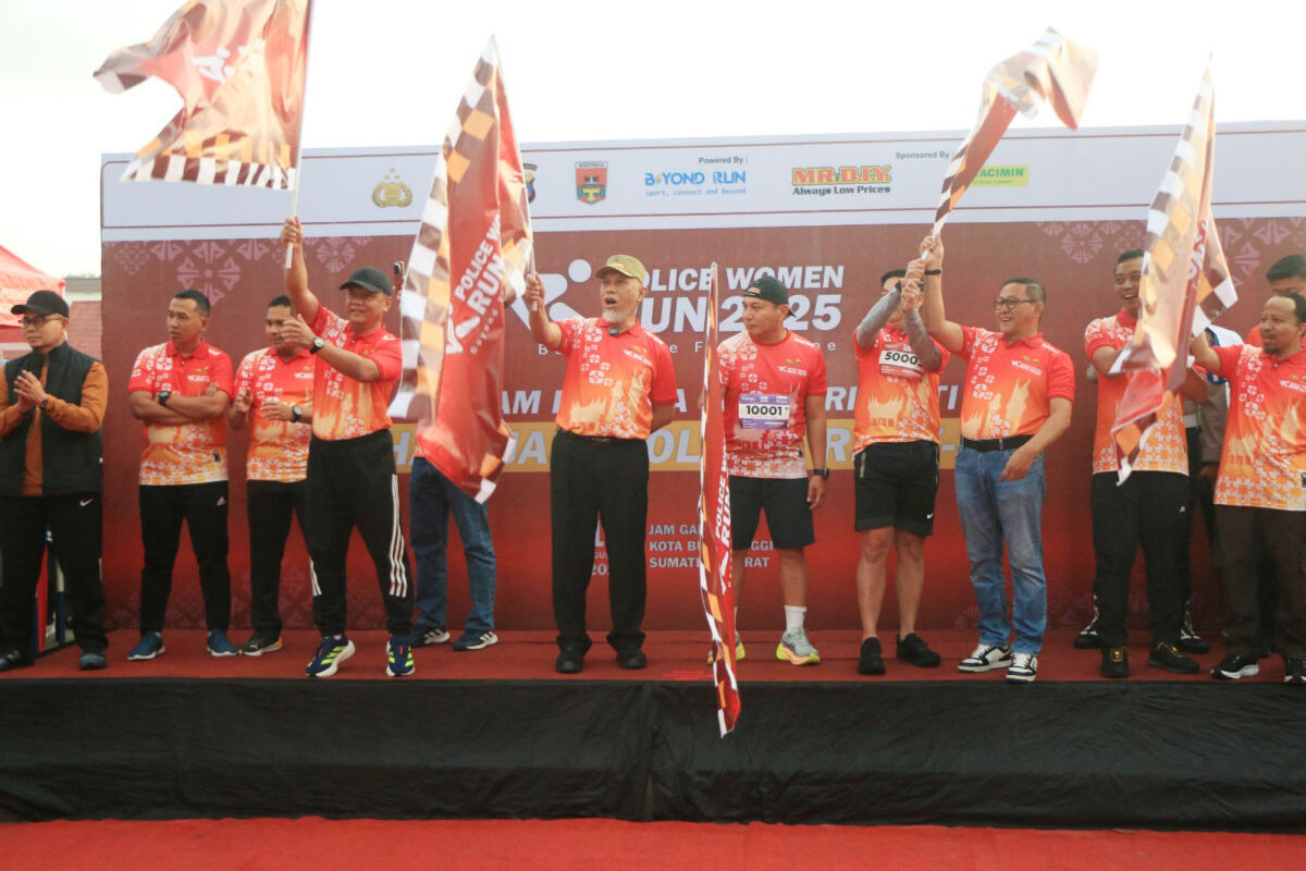 PWR— Kapolda Sumbar Irjen Pol Gatot Tri Suryanta, bersama Gubernur Sumbar Mahyeldi Ansharullah saat mengangkat bendera sebagai tanda dimulainya Police Women Run (PWR) 2025 di Bukittinggi.