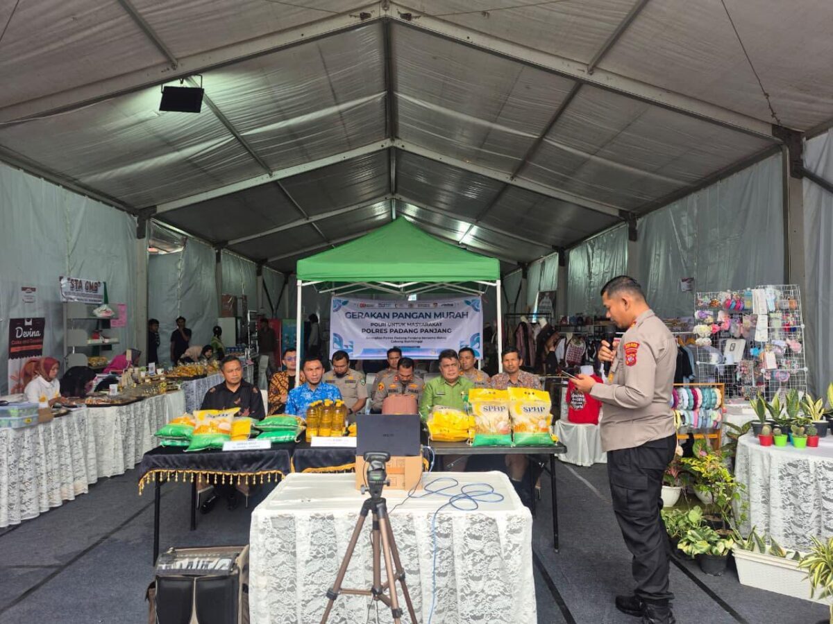 TANAHDATAR, METRO–Mendukung stabilitas harga pangan Polres Tanah Datar berkolaborasi dengan Bulog, Kamis (14/8) menggelar gerakan pangan murah yang difokuskan di sekitaran depan lapangan Cindua Mato Batusangkar.