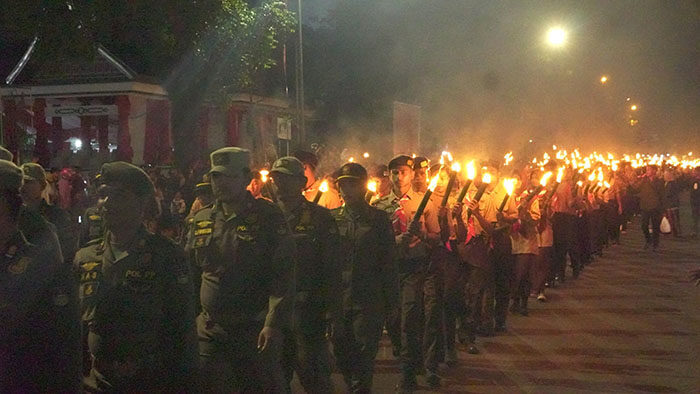 Usai apel pembukaan, ribuan peserta yang terdiri dari anggota TNI, Polri, organisasi masyarakat, pelajar, dan pramuka mulai bergerak menyusuri jalan utama kota dengan obor menyala di tangan. Suasana semakin meriah dengan iringan marching band yang membangkitkan semangat kebangsaan. Deretan obor yang memadati jalan menciptakan pemandangan indah sekaligus menjadi simbol api perjuangan yang te­rus menyala dalam diri generasi penerus bangsa. (pry)