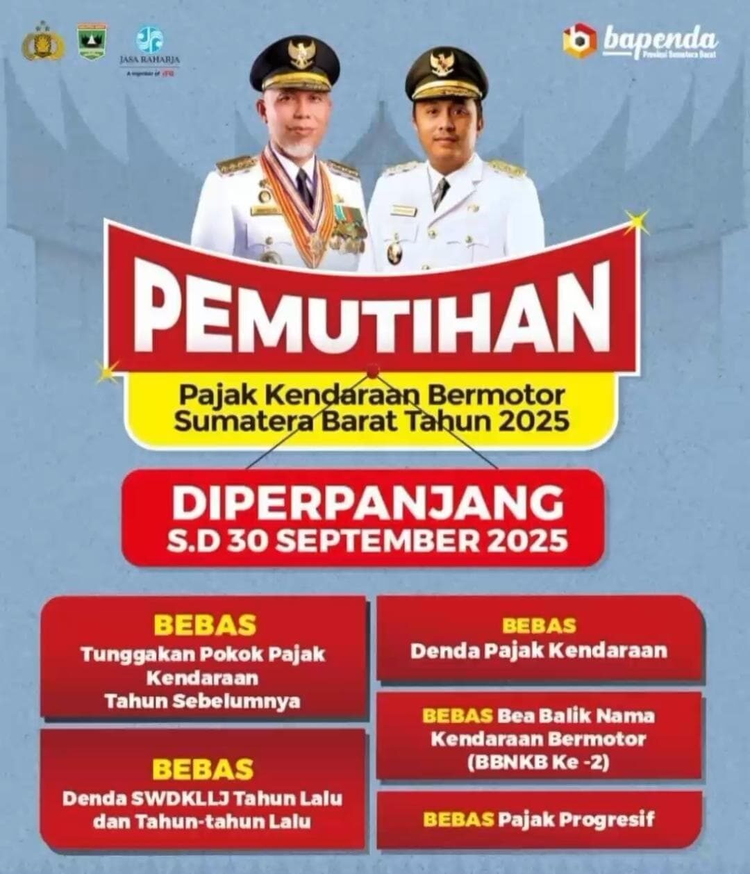 PADANG, METRO–Pemerintah Provinsi Sumatera Barat (Pemprov Sumbar) melalui Badan Pendapatan Daerah (Bapenda) memperpanjang masa pemutihan pajak kendaraan bermotor (PKB) hingga 30 September 2025.