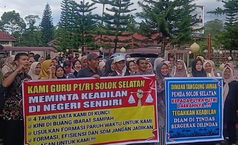 SOLSEL, METRO –Ratusan guru honorer yang tergabung dalam pengurus Forum Guru Kategori 2 (K2) dan Guru Prioritas di Kabupaten Solok Selatan menuntut hak mereka untuk diangkat menjadi guru Pegawai Pemerintah dengan Perjanjian Kerja (PPPK) penuh waktu dan paruh waktu.