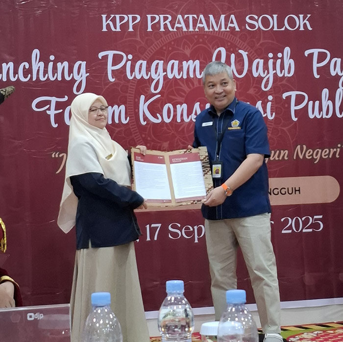 METRO, SOLOK–Langkah sosialisasi sepertinya harus gencar dilakukan KPP Pratama Solok dalam meningkatkan kesadaran wajib pajak (WP) menunaikan kewajibanya. Meningkatkan saling adanya rasa kepercayaan antar wajib pajak dan negara, juga perlu menjadi perhatian. Menyadari berbagai hal tersebut, KPP Pratama Solok meluncurkan piagam wajib pajak dan forum konsultasi publik tahun 2025 ini.