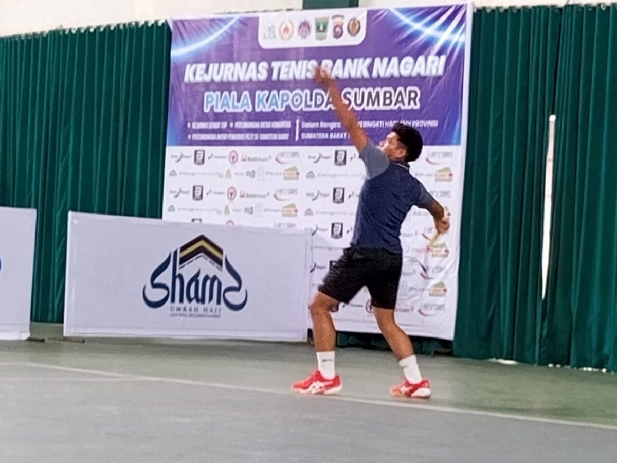 PADANG, METRO–Atlet Tenis tuan rumah Sumatera Barat, Jateng, Jatim, Kalsel mendominasi melaju ke partai quarter final ganda dan dan semifinal tunggal putra hari ketiga, Kejuarnas Tenis Senior TDP Bank Nagari-Piala Kapolda Sumbar, Rabu (1/9).