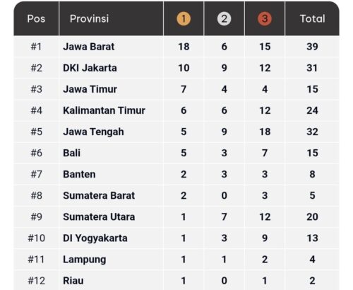 Sementara posisi teratas masih jadi milik Jawa Barat dengan raihan 18 emas, enam perak, 15 perunggu. Peringkat kedua diikuti DKI Jakarta dengan 10, sembilan perak 12 perunggu, dan posisi le tiga jadi milik Jawa Timur dengan tujuh emas, empat perak, empat perunggu.