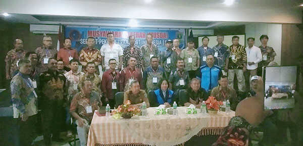 FOTO BERSAMA—Sekum F SPTI Pusat Viktoria Wewo, Chandra, dan pengurus terpilih foto bersama usai acara musda.